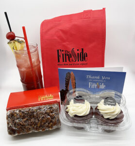The package includes a two-pack of Red Velvet Cupcakes and a package of delicious Pecan Treasures from our Bakery in a re-usable Fireside tote bag along with a souvenir photograph and two glasses of our Celebration Punch – a celebratory mix of fresh tropical fruit juices, pineapple rum, and a splash of white soda – available with or without alcohol.